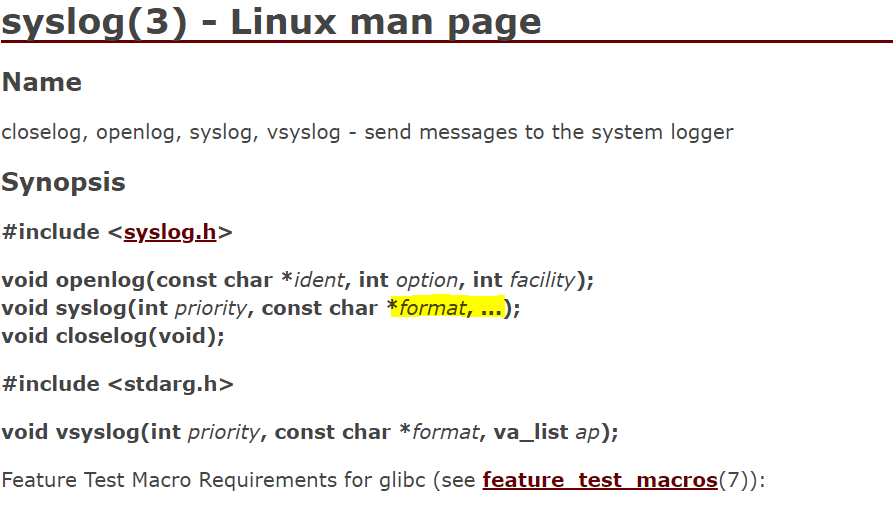 The HTTP server uses the syslog function to log. The client can put arbitrary input in the format part of this function.