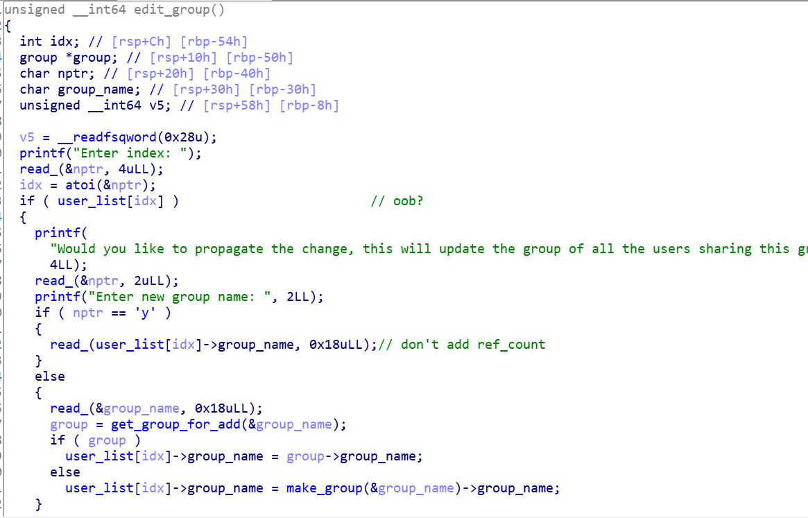 취약점은 edit group에서 발생한다. propagate를 할 건지 묻는 질문에 y를 입력하면 user의 group_name을 수정할 때 ref_count를 건드리지 않는다. 따라서 group_name이 A인 group과 B인 그룹이 있을 때, B group의 이름을 A로 수정하면 A와 B는 다른 그룹이지만 같은 이름을 갖는다. 따라서 B 그룹의 멤버를 삭제하면 A와 B의 ref_count가 함께 감소한다. 따라서 B의 유저를 감소시켜 A 그룹의 ref_count를 0으로 만든다면, A 그룹의 유저에 대한 use after free 취약점이 발생한다.