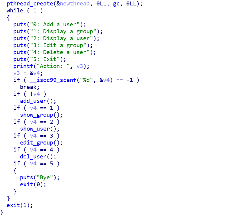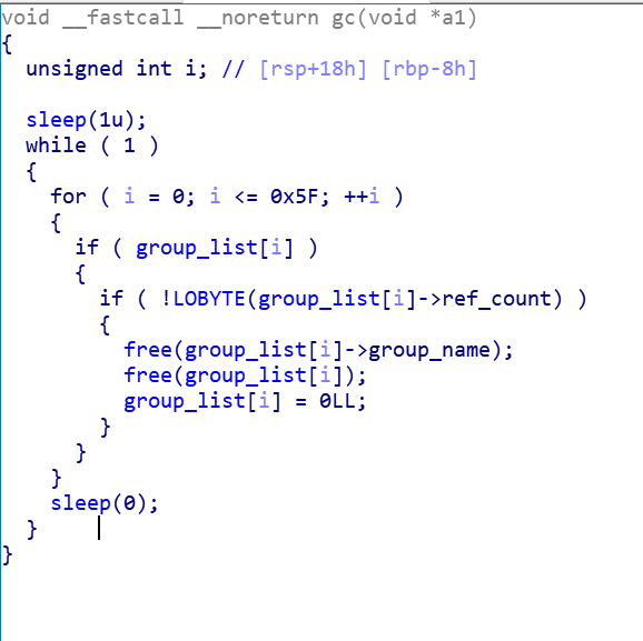 sgc 바이너리를 리버싱하면 user과 user들이 속하는 group을 만들어 관리하는 프로그램임을 알 수 있다. 다만 while 문에 들어가서 전에 gc라는 thread를 실행한다. user 구조체과 group 구조체는 아래와 같다.